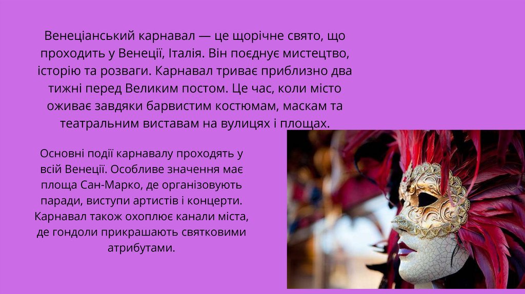 Венеціанський карнавал — це щорічне свято, щопроходить у Венеції, Італія. Він поєднує мистецтво,