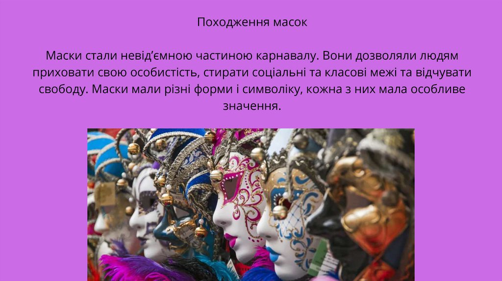 Походження масокМаски стали невід’ємною частиною карнавалу. Вони дозволяли людям