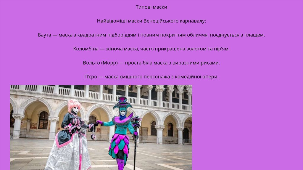 Типові маскиНайвідоміші маски Венеційського карнавалу: