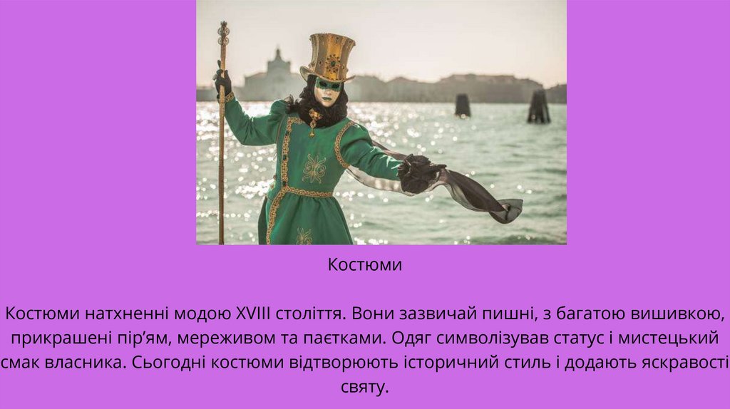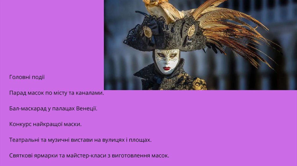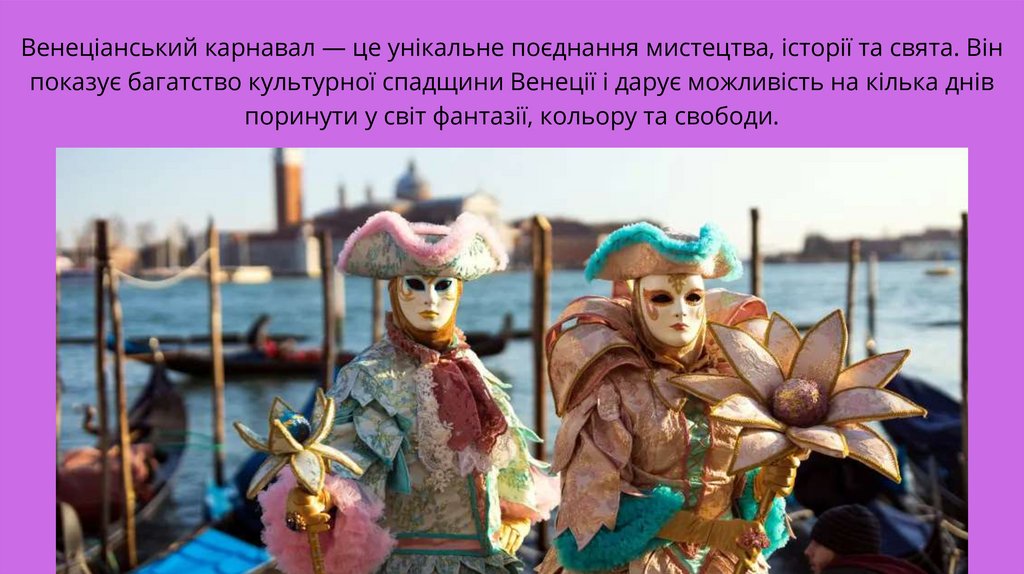 Венеціанський карнавал — це унікальне поєднання мистецтва, історії та свята. Вінпоказує багатство культурної спадщини Венеції і дарує можливість на кілька днів