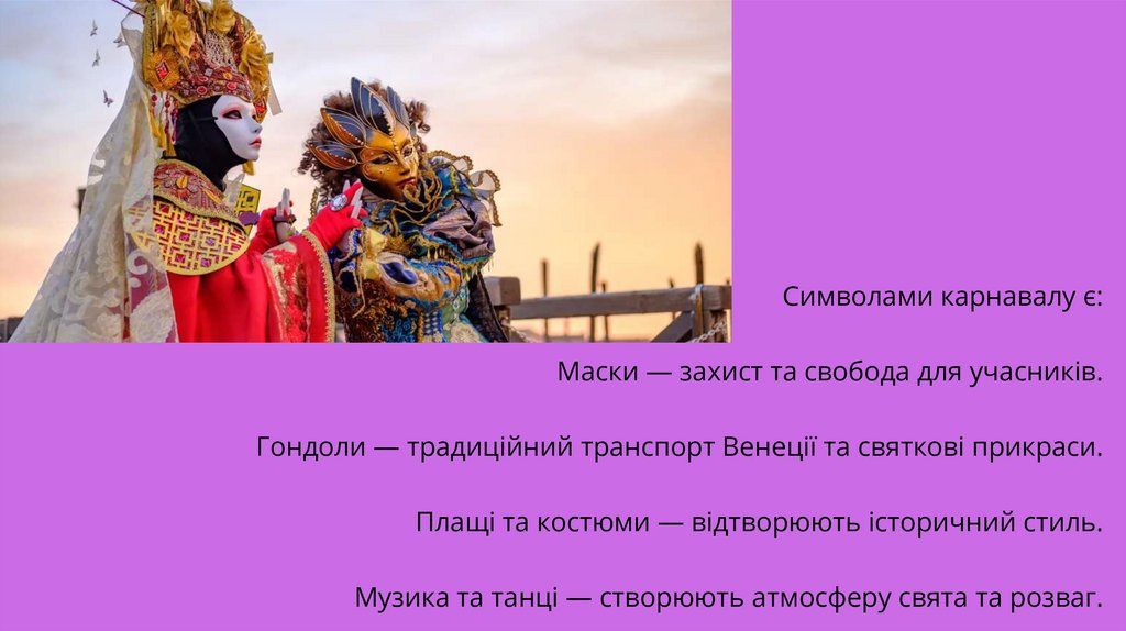 Символами карнавалу є:Маски — захист та свобода для учасників.