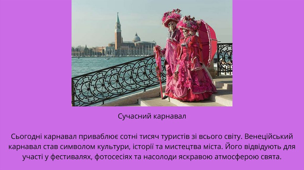 Сучасний карнавалСьогодні карнавал приваблює сотні тисяч туристів зі всього світу. Венеційський