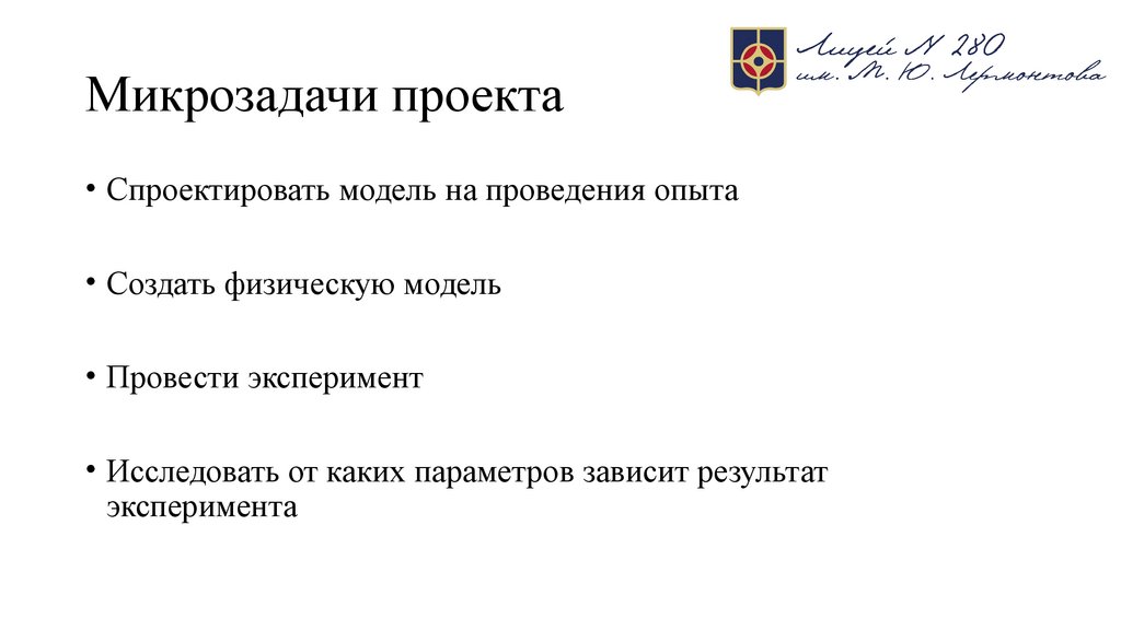 Микрозадачи проекта• Спроектировать модель на проведения опыта