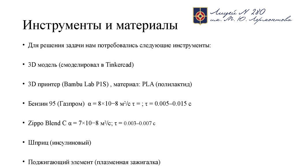 Инструменты и материалы• Для решения задачи нам потребовались следующие инструменты:
