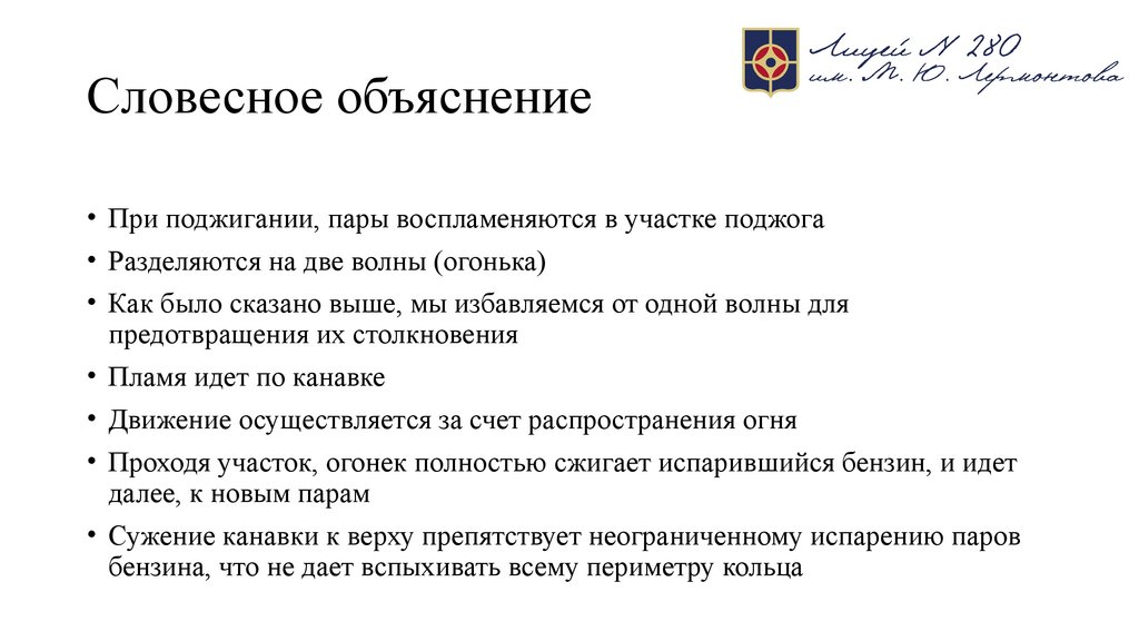 Словесное объяснение• При поджигании, пары воспламеняются в участке поджога
