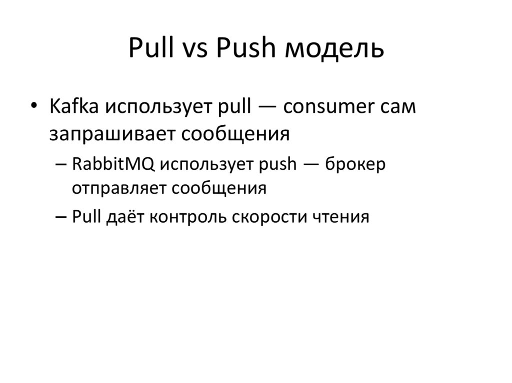 Pull vs Push модель• Kafka использует pull — consumer сам