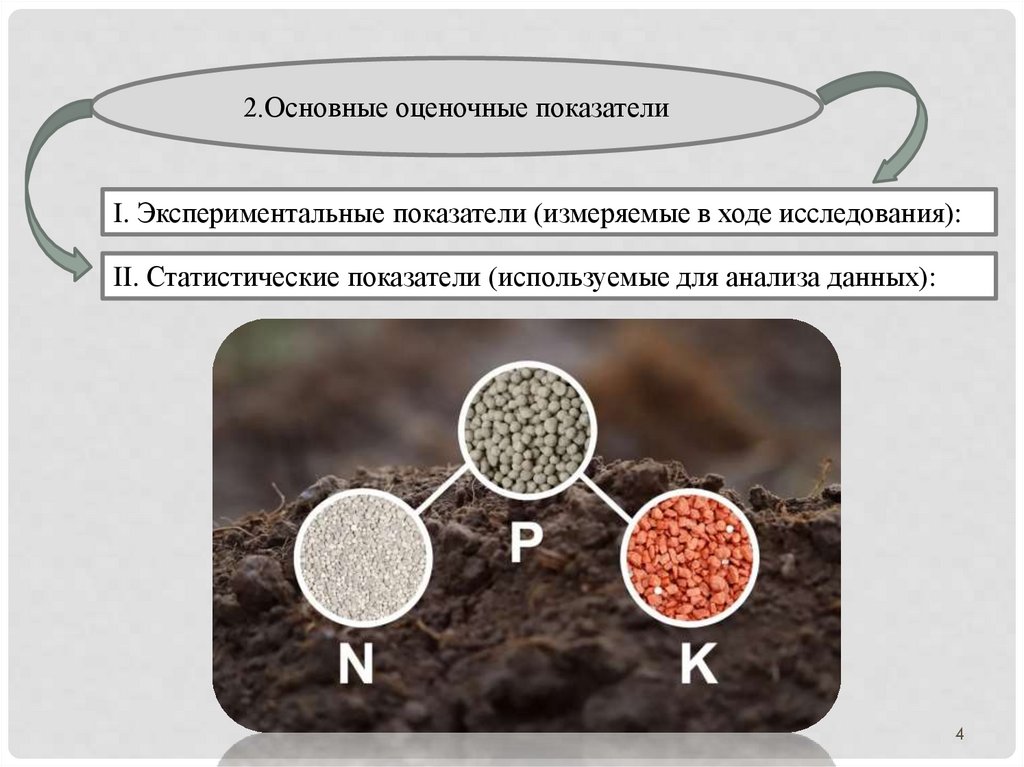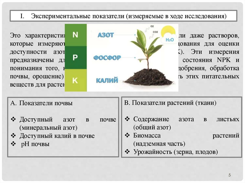 I. Экспериментальные показатели (измеряемые в ходе исследования)Это характеристики или свойства почвы, растений или даже растворов,