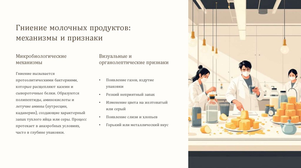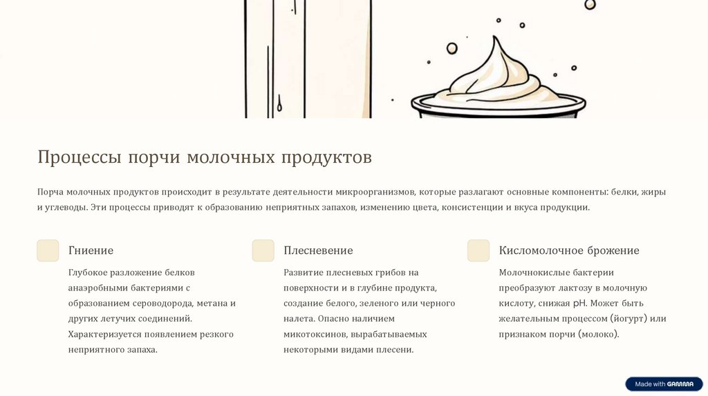 Процессы порчи молочных продуктовПорча молочных продуктов происходит в результате деятельности микроорганизмов, которые разлагают основные компоненты: белки, жиры