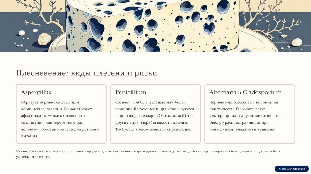 Важно: Все плесневые поражения молочных продуктов, за исключением контролируемого производства специальных сортов сыра, считаются дефектом и должны быть