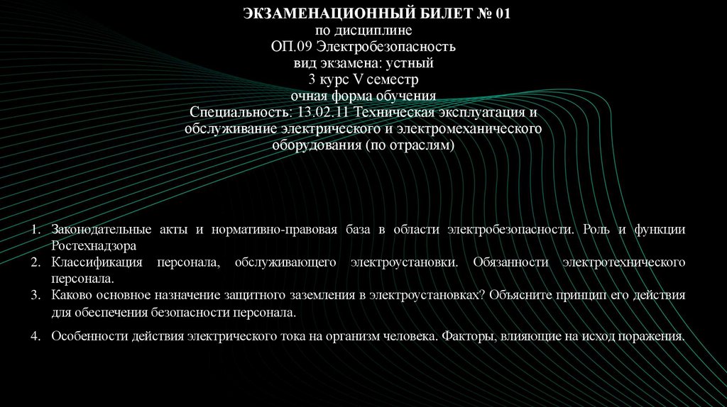 1. ЭКЗАМЕНАЦИОННЫЙ БИЛЕТ № 01 по дисциплине ОП.09 Электробезопасность вид экзамена: устный 3 курс V семестр очная форма обучения