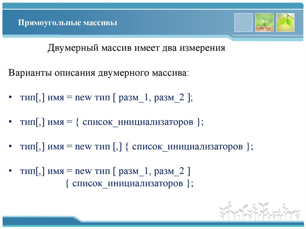 • тип[,] имя = new тип [,] { список_инициализаторов };