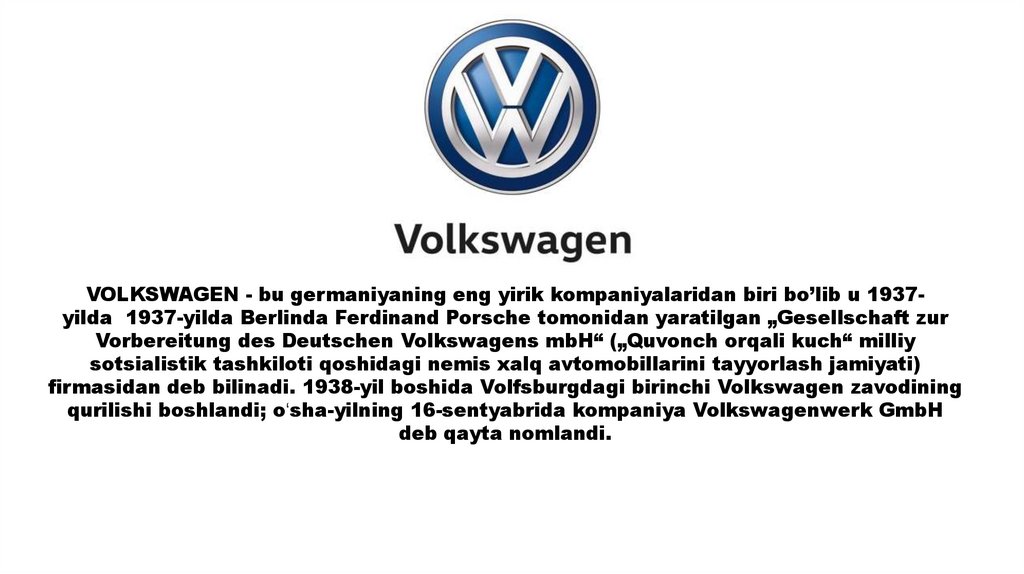 VOLKSWAGEN - bu germaniyaning eng yirik kompaniyalaridan biri bo’lib u 1937yilda 1937-yilda Berlinda Ferdinand Porsche tomonidan yaratilgan „Gesellschaft zurVorbereitung des Deutschen Volkswagens mbH“ („Quvonch orqali kuch“ milliy