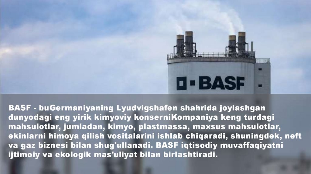 BASF - buGermaniyaning Lyudvigshafen shahrida joylashgandunyodagi eng yirik kimyoviy konserniKompaniya keng turdagi