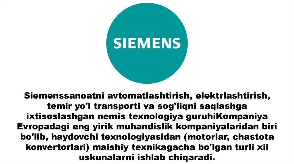 Siemenssanoatni avtomatlashtirish, elektrlashtirish,temir yo'l transporti va sog'liqni saqlashga