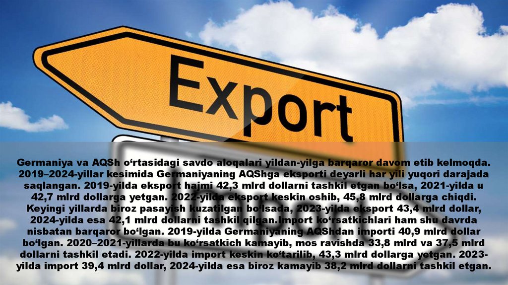 Germaniya va AQSh o‘rtasidagi savdo aloqalari yildan-yilga barqaror davom etib kelmoqda.2019–2024-yillar kesimida Germaniyaning AQShga eksporti deyarli har yili yuqori darajada