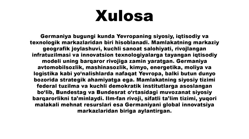 XulosaGermaniya bugungi kunda Yevropaning siyosiy, iqtisodiy va