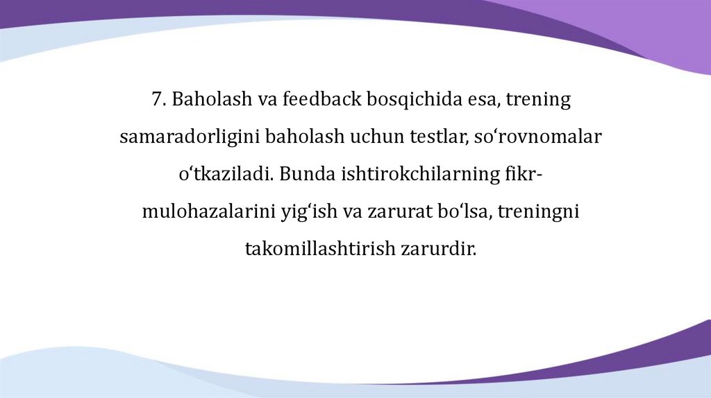 7. Baholash va feedback bosqichida esa, treningsamaradorligini baholash uchun testlar, so‘rovnomalar