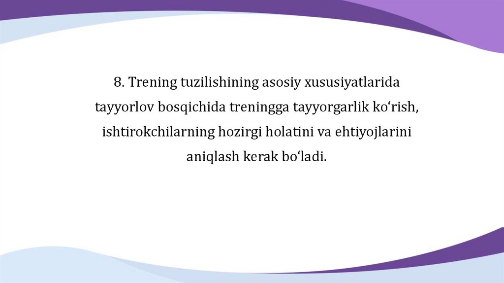 8. Trening tuzilishining asosiy xususiyatlaridatayyorlov bosqichida treningga tayyorgarlik ko‘rish,