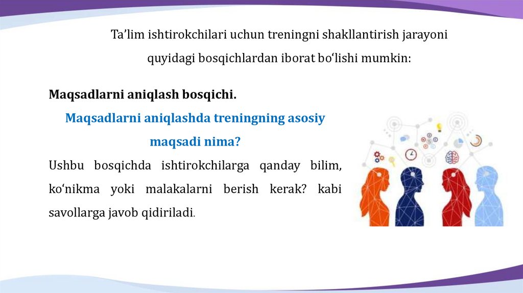 Taʼlim ishtirokchilari uchun treningni shakllantirish jarayoniquyidagi bosqichlardan iborat bo‘lishi mumkin: