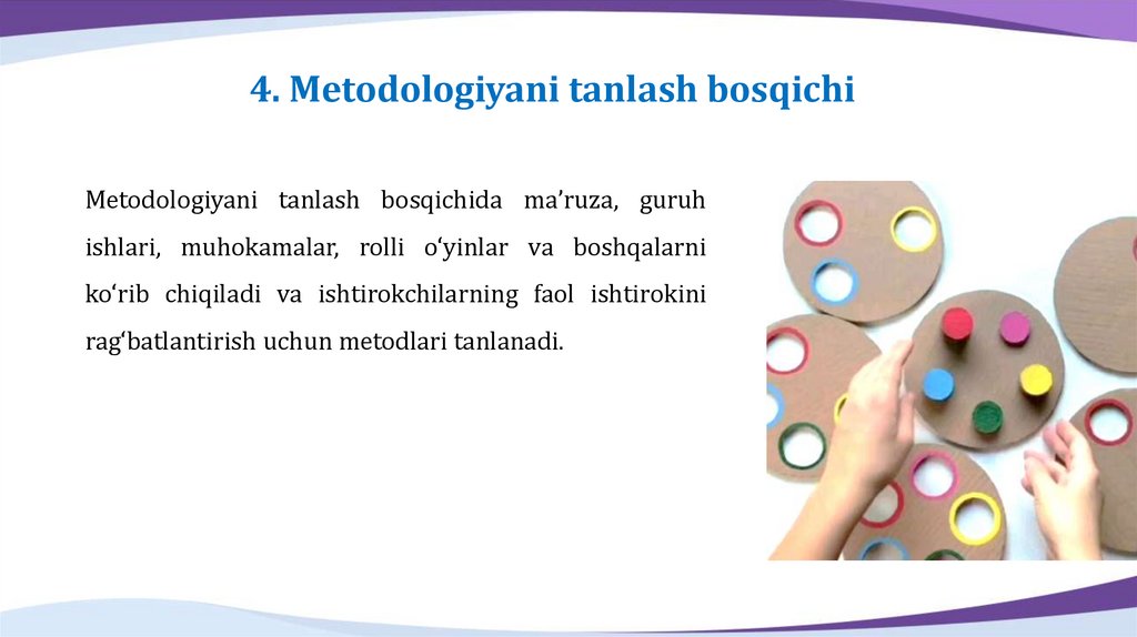 4. Metodologiyani tanlash bosqichiMetodologiyani tanlash bosqichida maʼruza, guruh