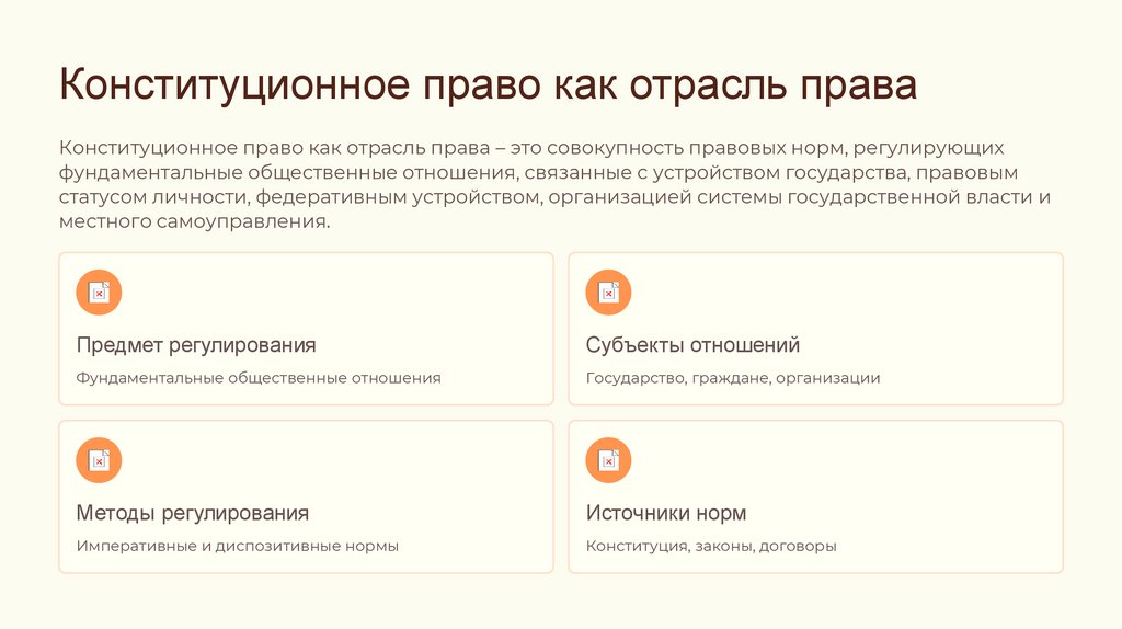 Конституционное право как отрасль праваКонституционное право как отрасль права – это совокупность правовых норм, регулирующих