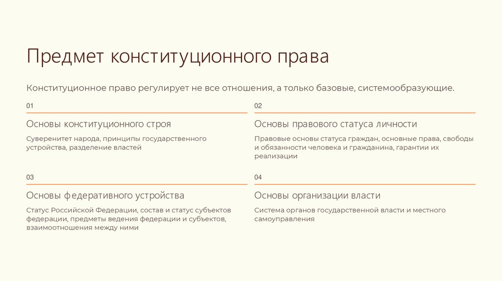 Предмет конституционного праваКонституционное право регулирует не все отношения, а только базовые, системообразующие.