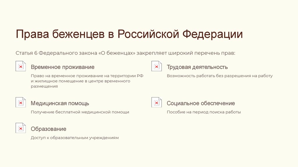 Права беженцев в Российской ФедерацииСтатья 6 Федерального закона «О беженцах» закрепляет широкий перечень прав:
