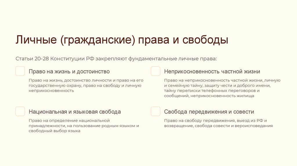 Личные (гражданские) права и свободыСтатьи 20-28 Конституции РФ закрепляют фундаментальные личные права: