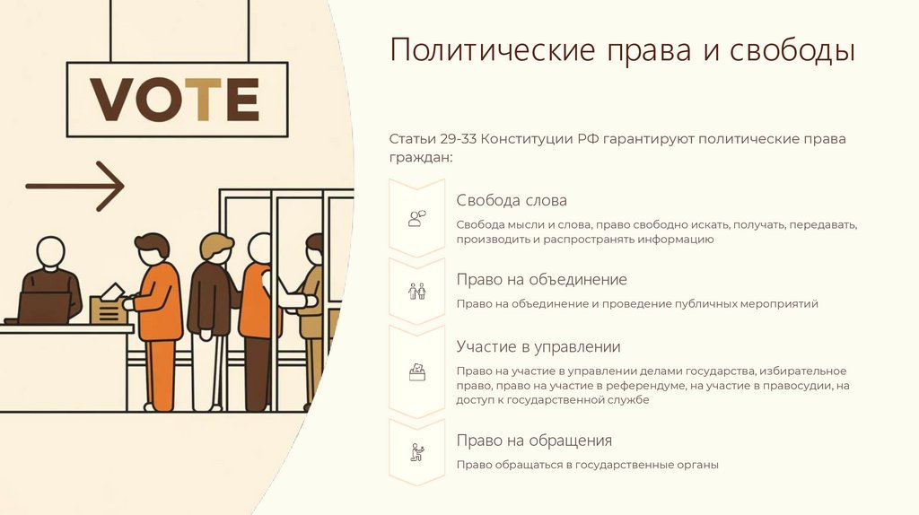 Политические права и свободыСтатьи 29-33 Конституции РФ гарантируют политические права