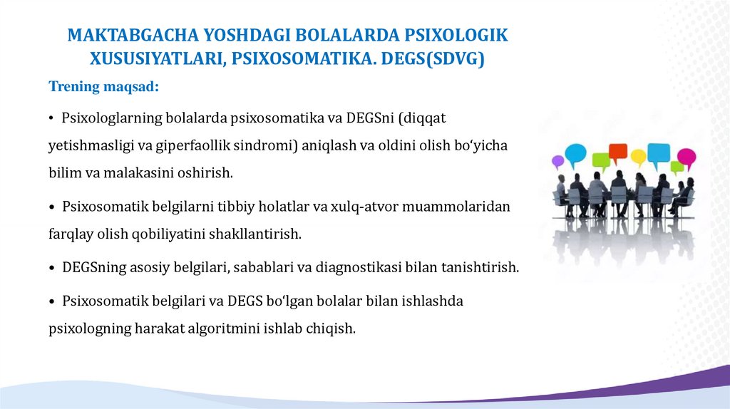 • Psixologlarning bolalarda psixosomatika va DEGSni (diqqat