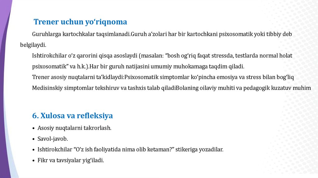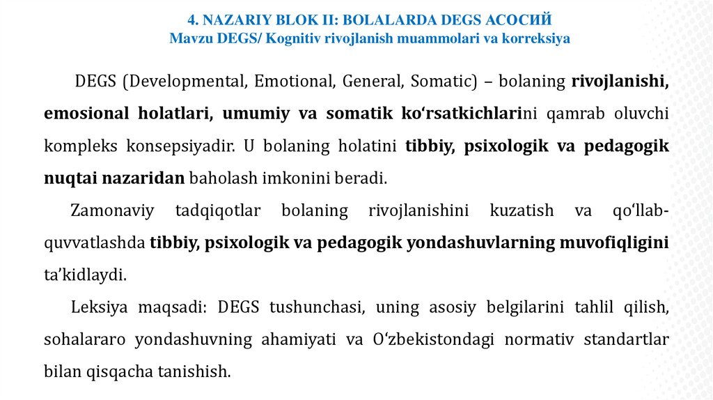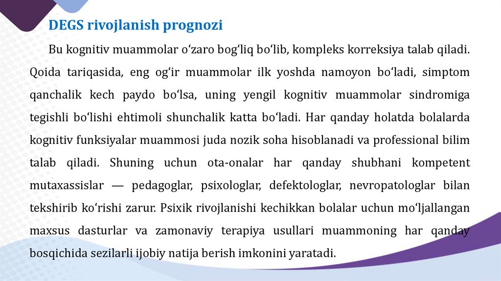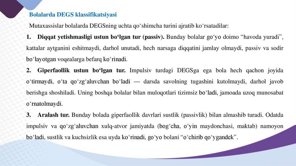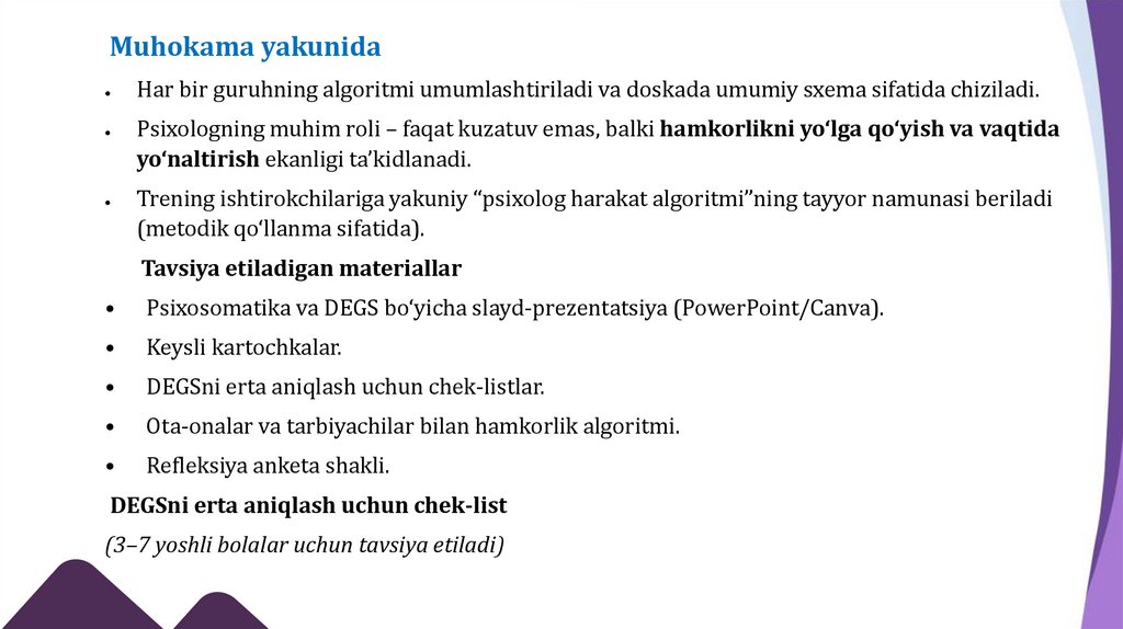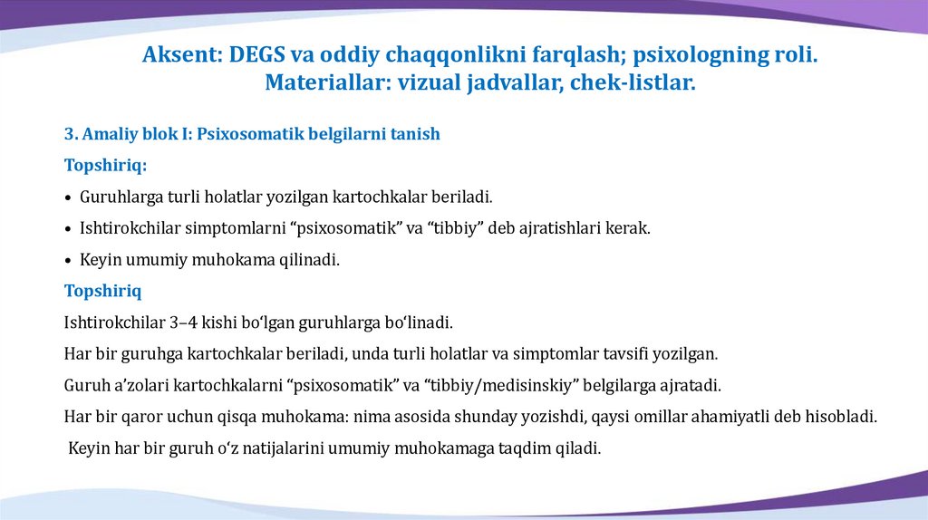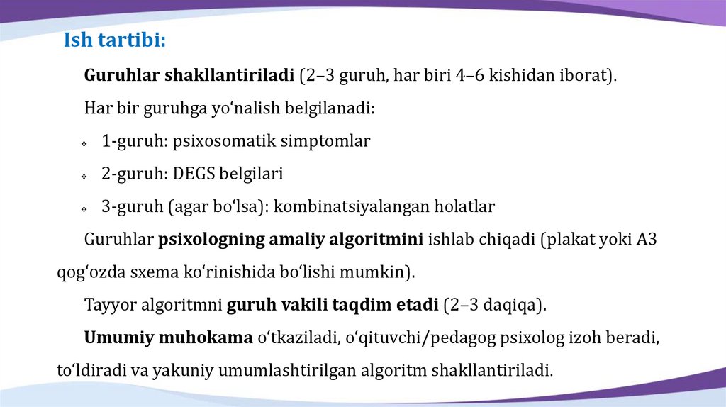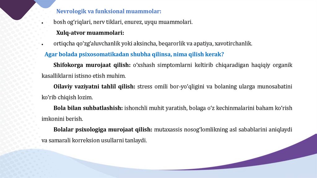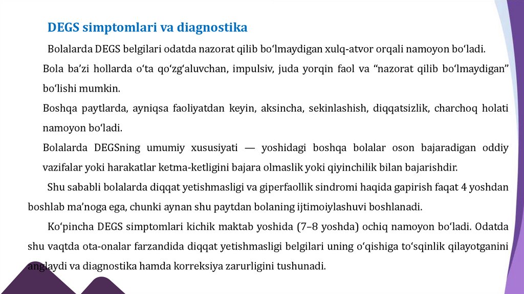• Psixosomatik belgilari va DEGS bo‘lgan bolalar bilan ishlashda
