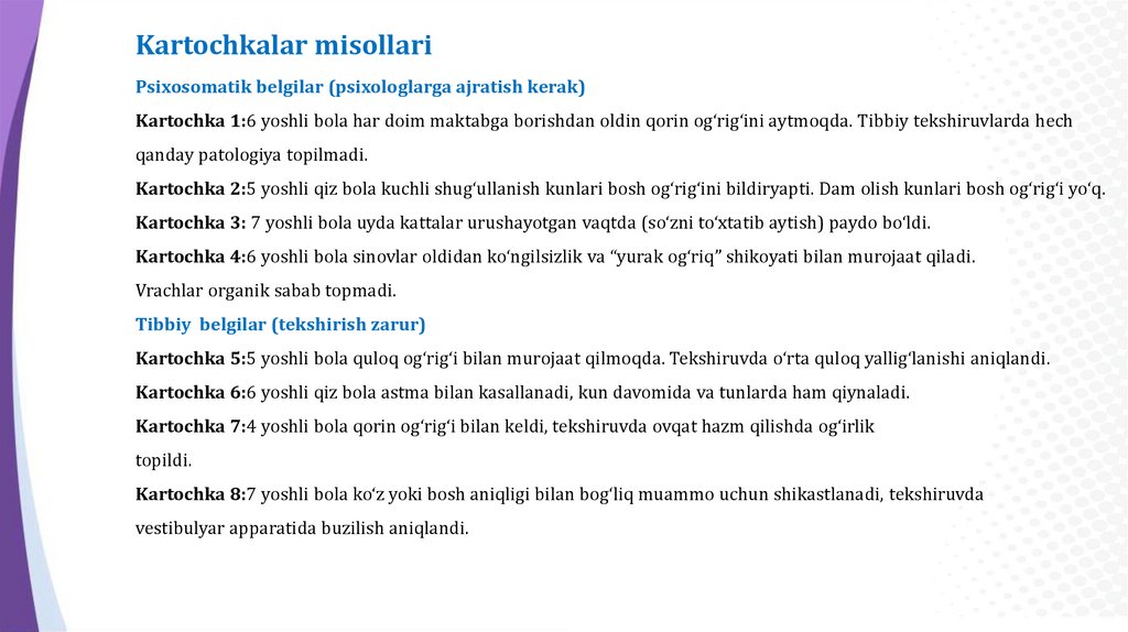 • Psixosomatik belgilarni tibbiy holatlar va xulq-atvor muammolaridan