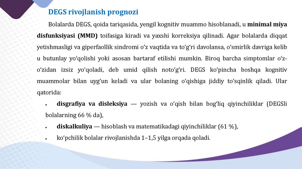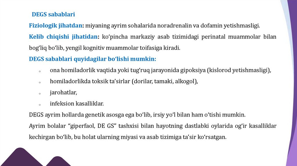 • DEGSning asosiy belgilari, sabablari va diagnostikasi bilan tanishtirish.