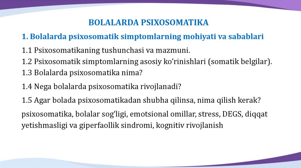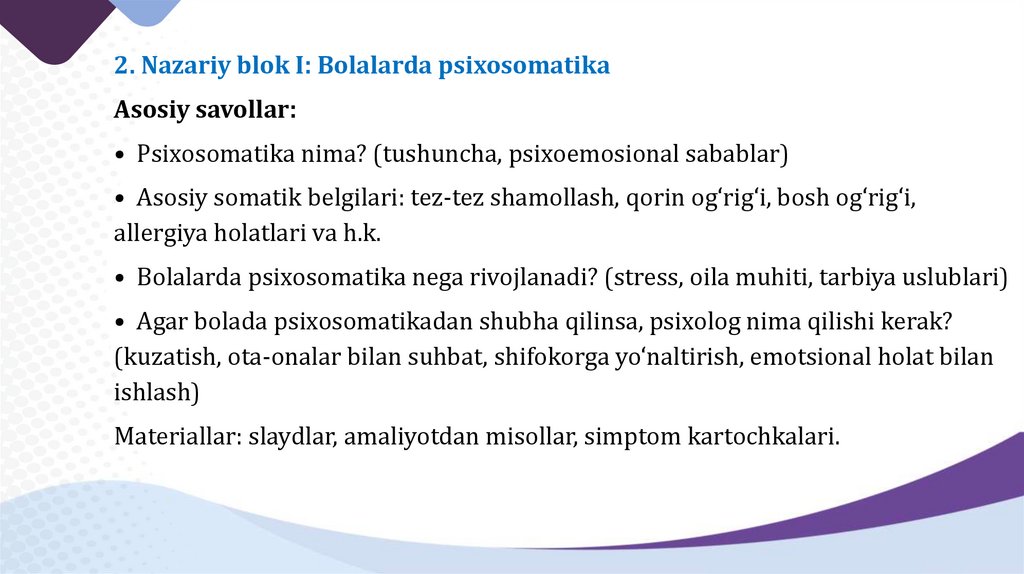 2. Nazariy blok I: Bolalarda psixosomatikaAsosiy savollar: