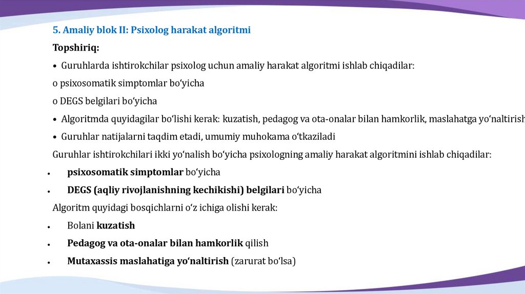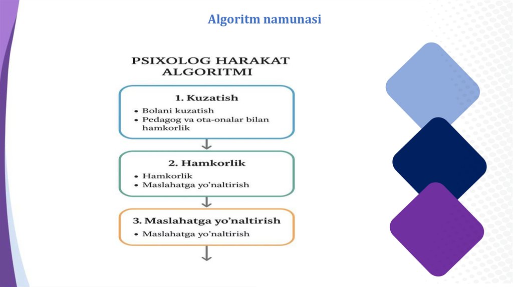 Trening ishtirokchilariga yakuniy “psixolog harakat algoritmi”ning tayyor namunasi beriladi