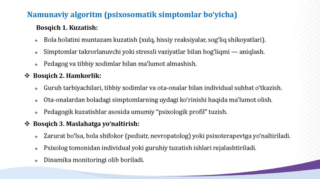 Namunaviy algoritm (psixosomatik simptomlar bo‘yicha)Bosqich 1. Kuzatish: