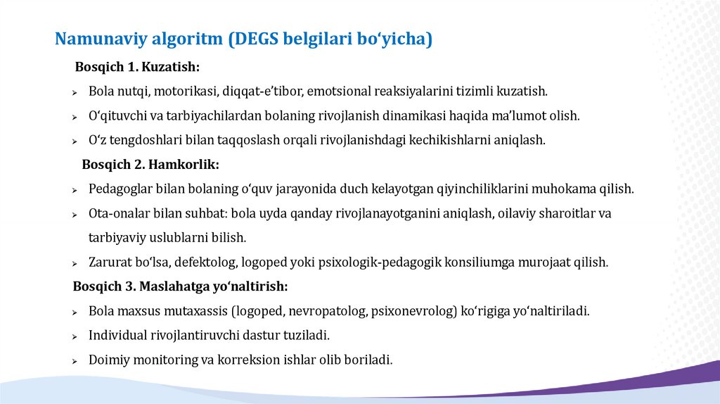 (kuzatish, ota-onalar bilan suhbat, shifokorga yo‘naltirish, emotsional holat bilan