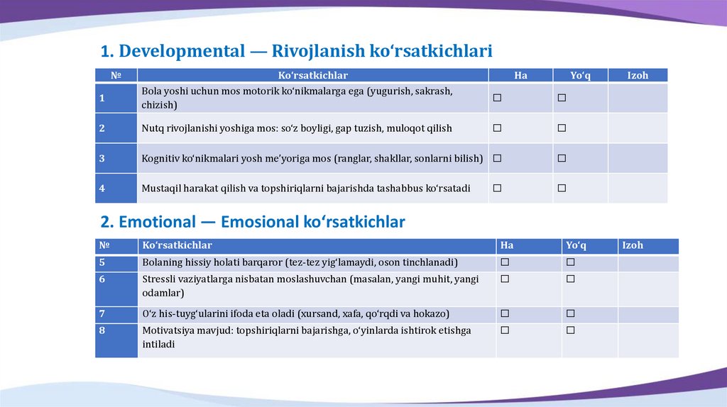 1. Developmental — Rivojlanish ko‘rsatkichlari№