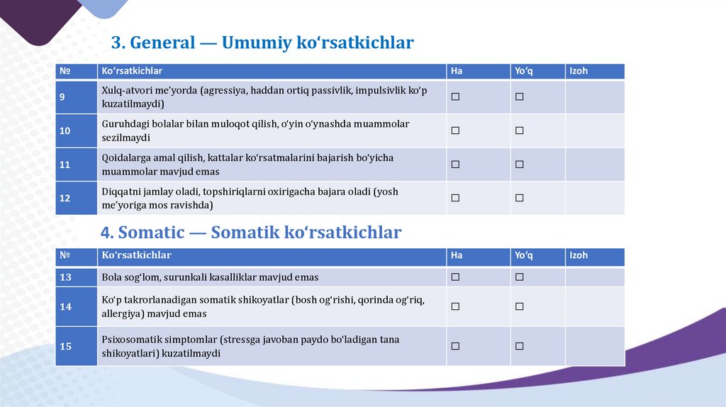 9–12 ta “Ha” javobi — ayrim rivojlanish/emotsional/somatik yo‘nalishlarda qo‘shimcha kuzatuv va