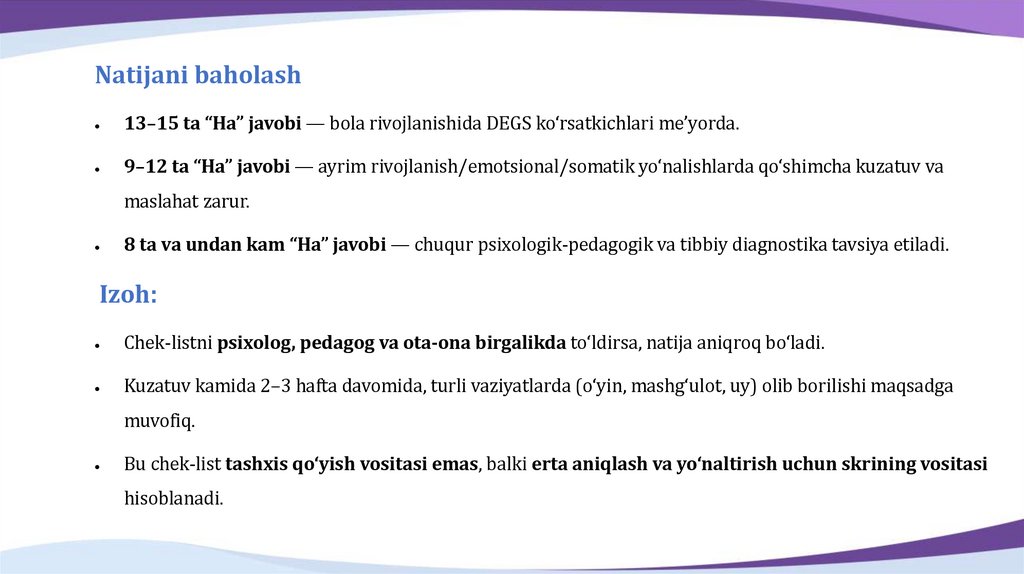 Natijani baholash13–15 ta “Ha” javobi — bola rivojlanishida DEGS ko‘rsatkichlari me’yorda.