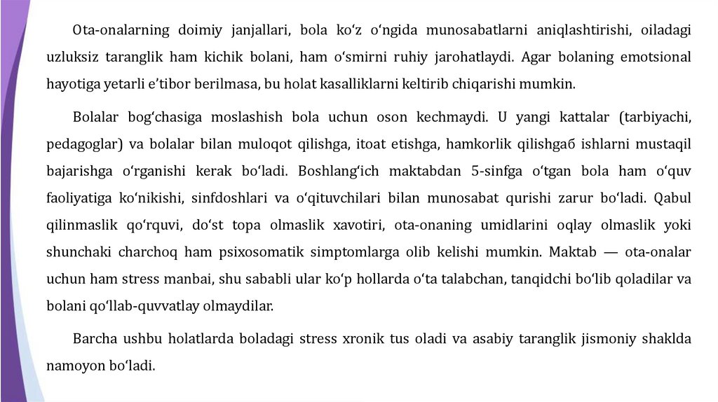 boʻlishi mumkin: stresslar uning ichki muhitida (oilada) ham, tashqi muhitida