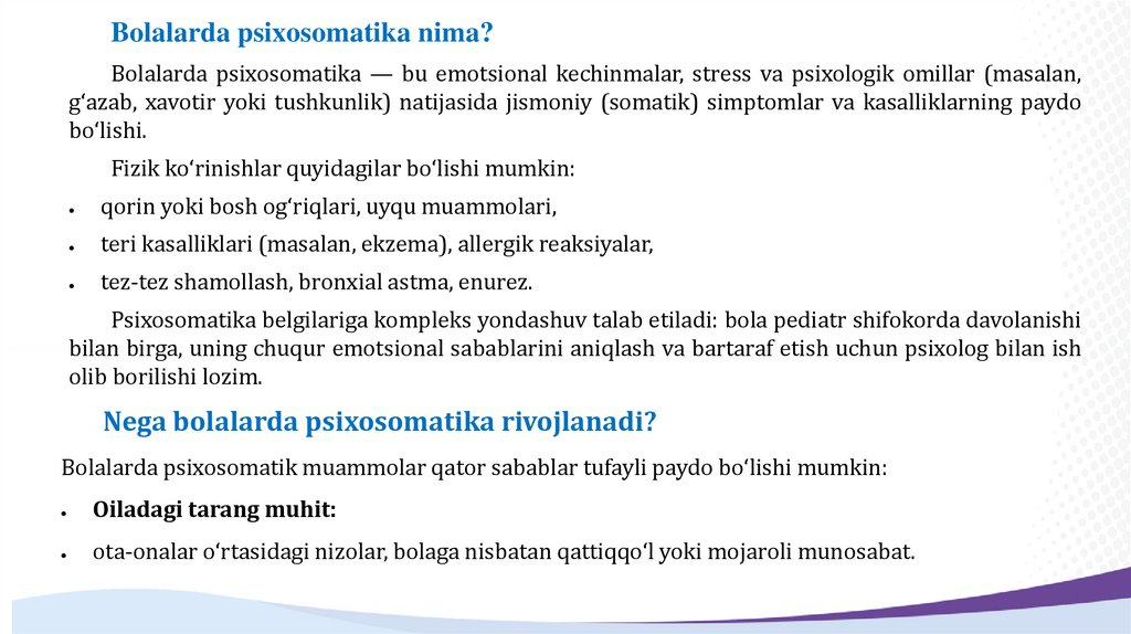 • Bolalarda psixosomatika nega rivojlanadi? (stress, oila muhiti, tarbiya uslublari)