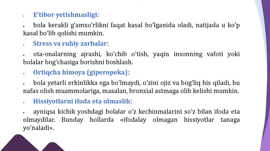 Eʼtibor yetishmasligi:bola kerakli gʻamxoʻrlikni faqat kasal boʻlganida oladi, natijada u koʻp