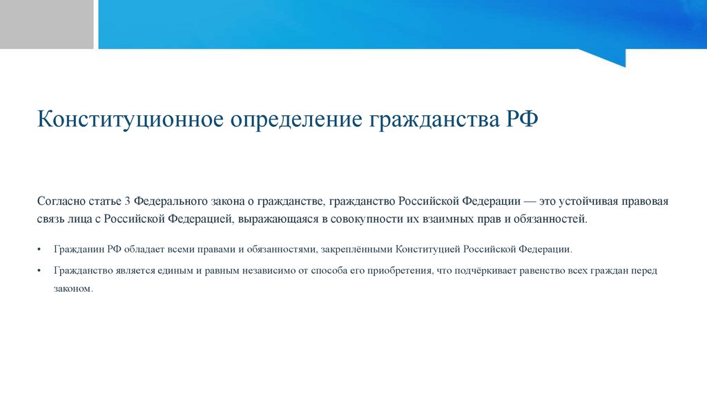 Конституционное определение гражданства РФСогласно статье 3 Федерального закона о гражданстве, гражданство Российской Федерации — это устойчивая правовая