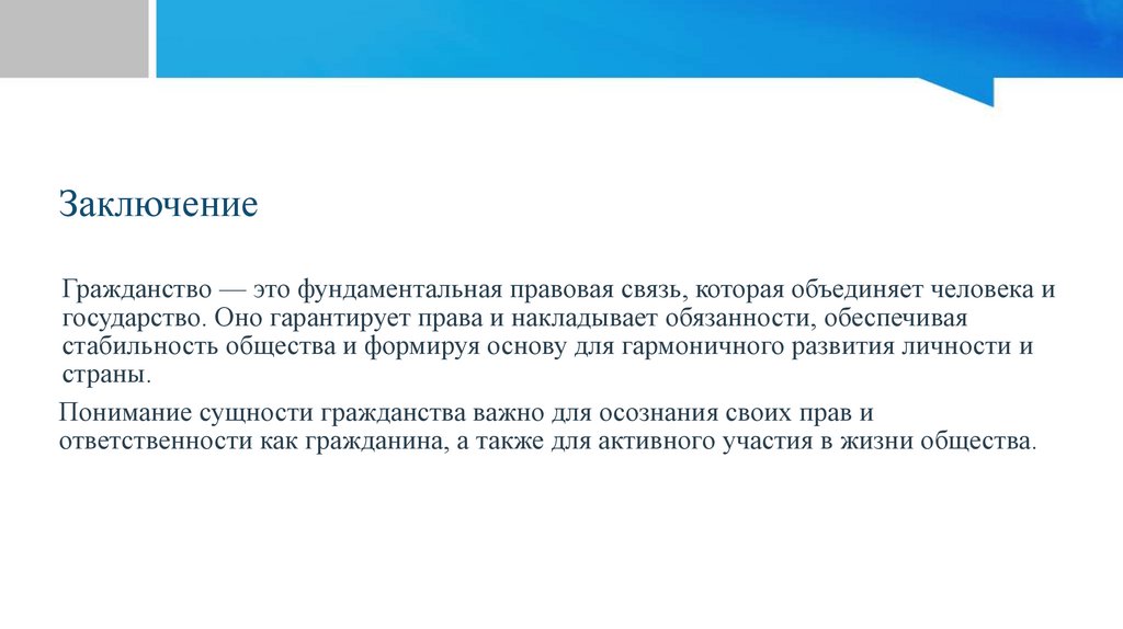 ЗаключениеГражданство — это фундаментальная правовая связь, которая объединяет человека и
