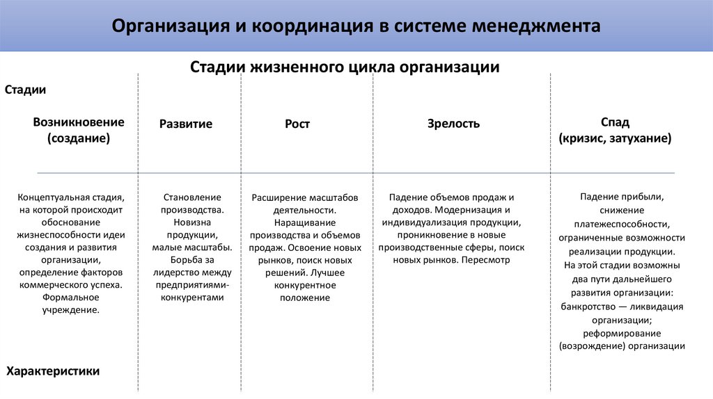 Организация и координация в системе менеджментаСтадии жизненного цикла организации