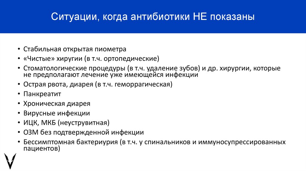 Ситуации, когда антибиотики НЕ показаны• Стабильная открытая пиометра