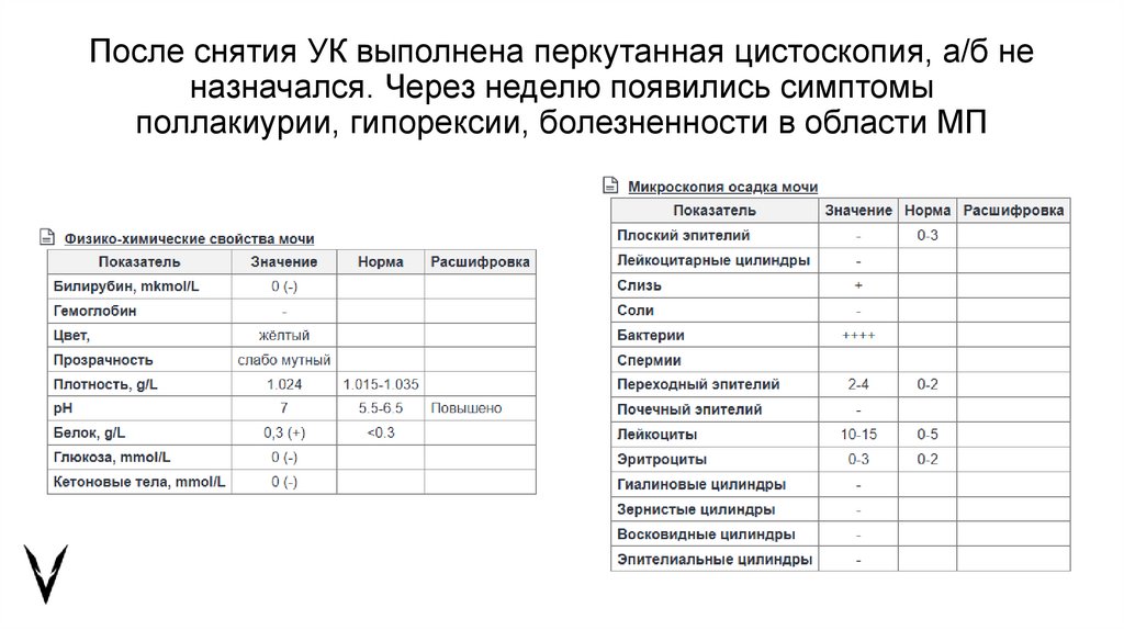 После снятия УК выполнена перкутанная цистоскопия, а/б неназначался. Через неделю появились симптомы