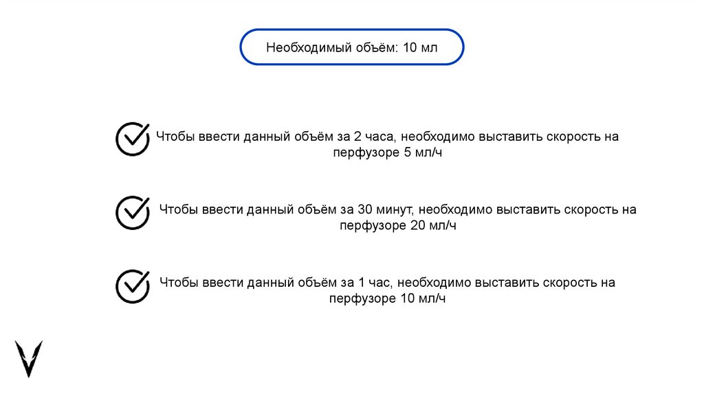 Необходимый объём: 10 млЧтобы ввести данный объём за 2 часа, необходимо выставить скорость на