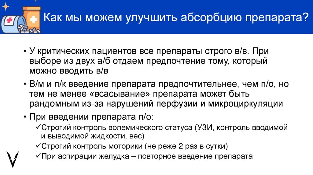 Как мы можем улучшить абсорбцию препарата?• У критических пациентов все препараты строго в/в. При